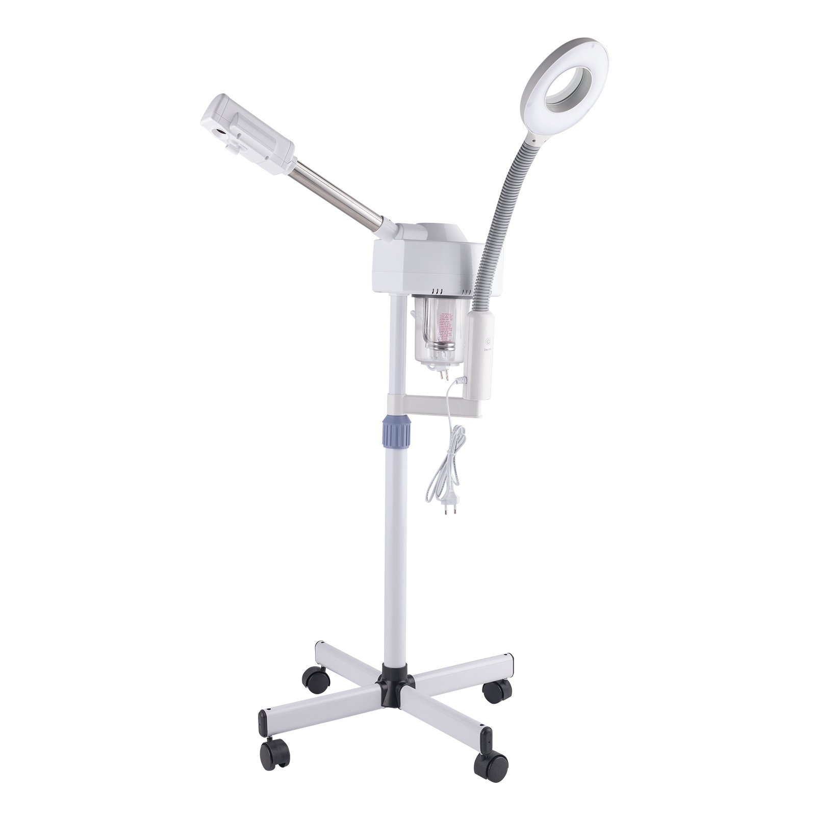 HYDRATES SKIN: It produce ionic ozone that mixed with steam, it can improve your texture of skin. The steamer for facial is suitable for a variety of skin, help to deal with skin problems.ADJUSTABLE AND FLEXIBLE: The beauty tools facial steamer's casters won't get caught in the hairs and move quick smoothly, you can flexibly adjust the height of the beauty steamer machine and the angle of the beauty lamp when needed.MAGNIFYING LAMP: The facial steamer with agnifying lamp, high quality bright magnifying glass help you see details clearly and you will know the true state of your skin.PROFESSIONAL CHOICE: The beauty tools facial steamer is suitable for most types of skin (like dry, oily skin), ideal for salon spas and beauty clinic. It also suitable for gifts to others because of beautiful appearance and practical functions.Assembly : This professional face steamer was easy to put together. and it has an opening in front of where the steam comes out where