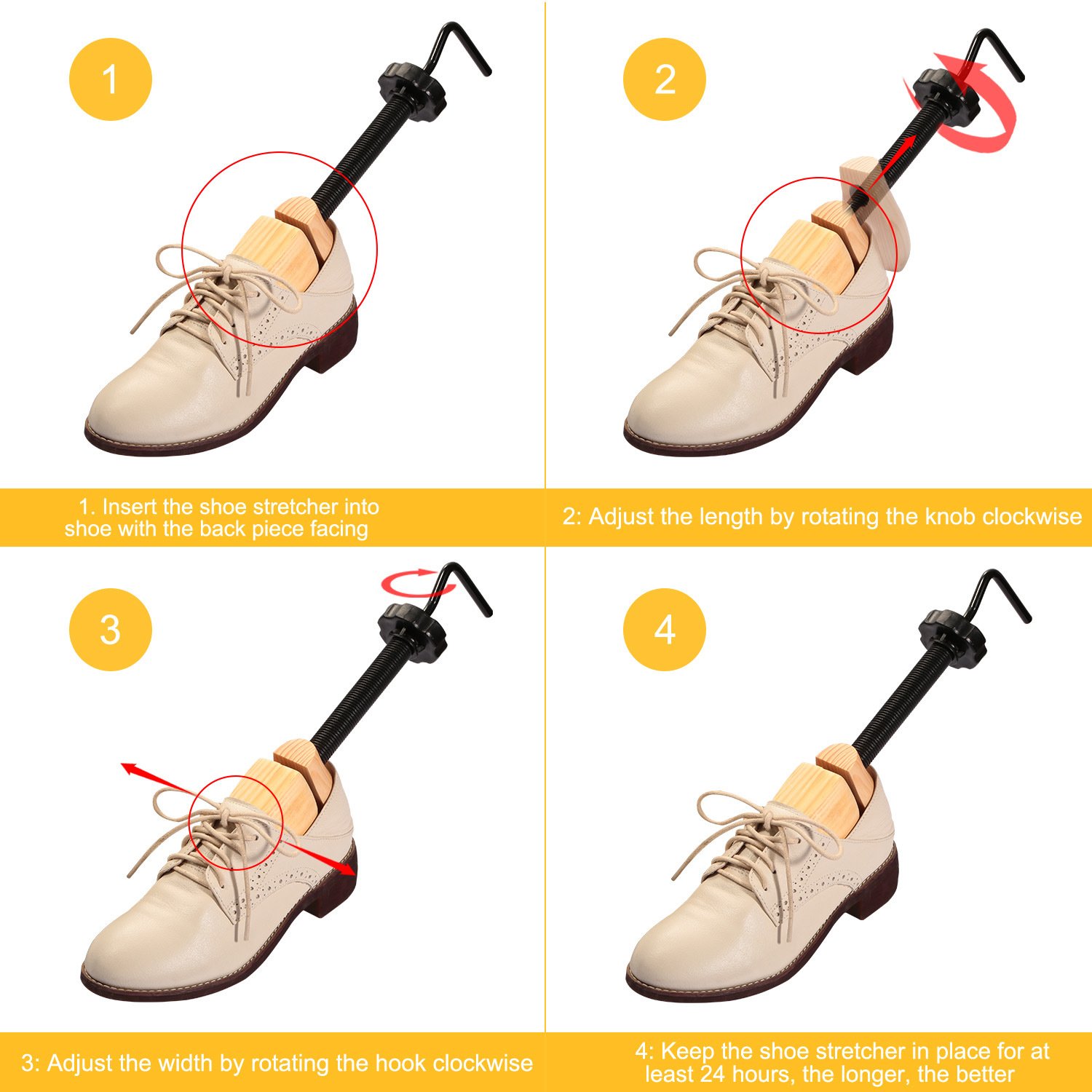 *Easy to Use*:Just insert the shoe stretchers into the shoes,and then rotate the knob clockwise to stretch the length of the shoes and rotate the hook clockwise to stretch the width of the shoes. The longer the shoe stretcher is inside,the more your shoes will stretch.