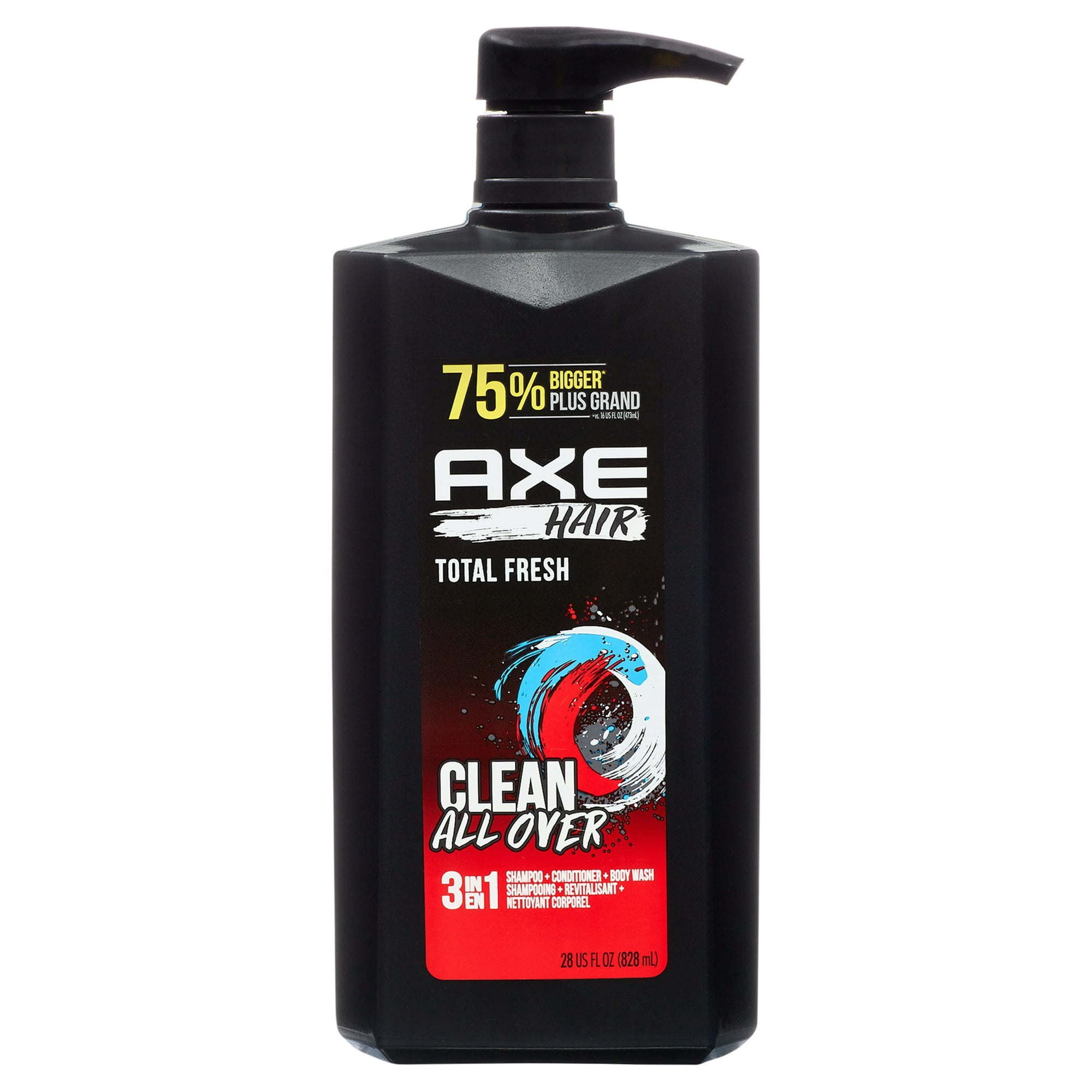 Axe Total Fresh 3-in-1 Shampoo Conditioner and Body Wash, 28 fl oz, Wash away bad vibes with AXE Total Fresh 3-in-1 men's moisturizing shampoo for hair and body wash and conditioner. You never know when opportunity will strike, so you need to smell your best whenever, wherever. Relax. At AXE, we got you. With AXE Total Fresh 3-in-1 Hair and Body Wash for Men, keeping your shower fresh from head to toe has never been easier. Refreshing, effortless, and deliciously foamy, this is your one-way ticket to extreme, all-over clean. Same great AXE hair care, a fresh new look. But what's on the inside matters too. Our 100% plant-based moisturizers keep your skin and hair feeling irresistibly soft, naturally. All day, all night, no matter what, you're ready. Fresher you, cleaner planet. By 2025, AXE aims for all our packaging to be recyclable or to include recycled materials.