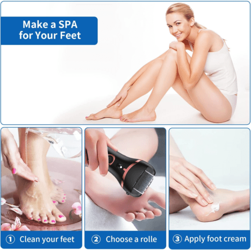 [Three Roller Heads] Come with 3 different style roller heads : 1 thin roller for daily foot care; 1 regular roller to remove dead skin; and 1 coarse roller for annoying calluses. The roller is composed of exfoliating micro-grains to easily and quickly remove all calluses for a very soft foot effect in no time