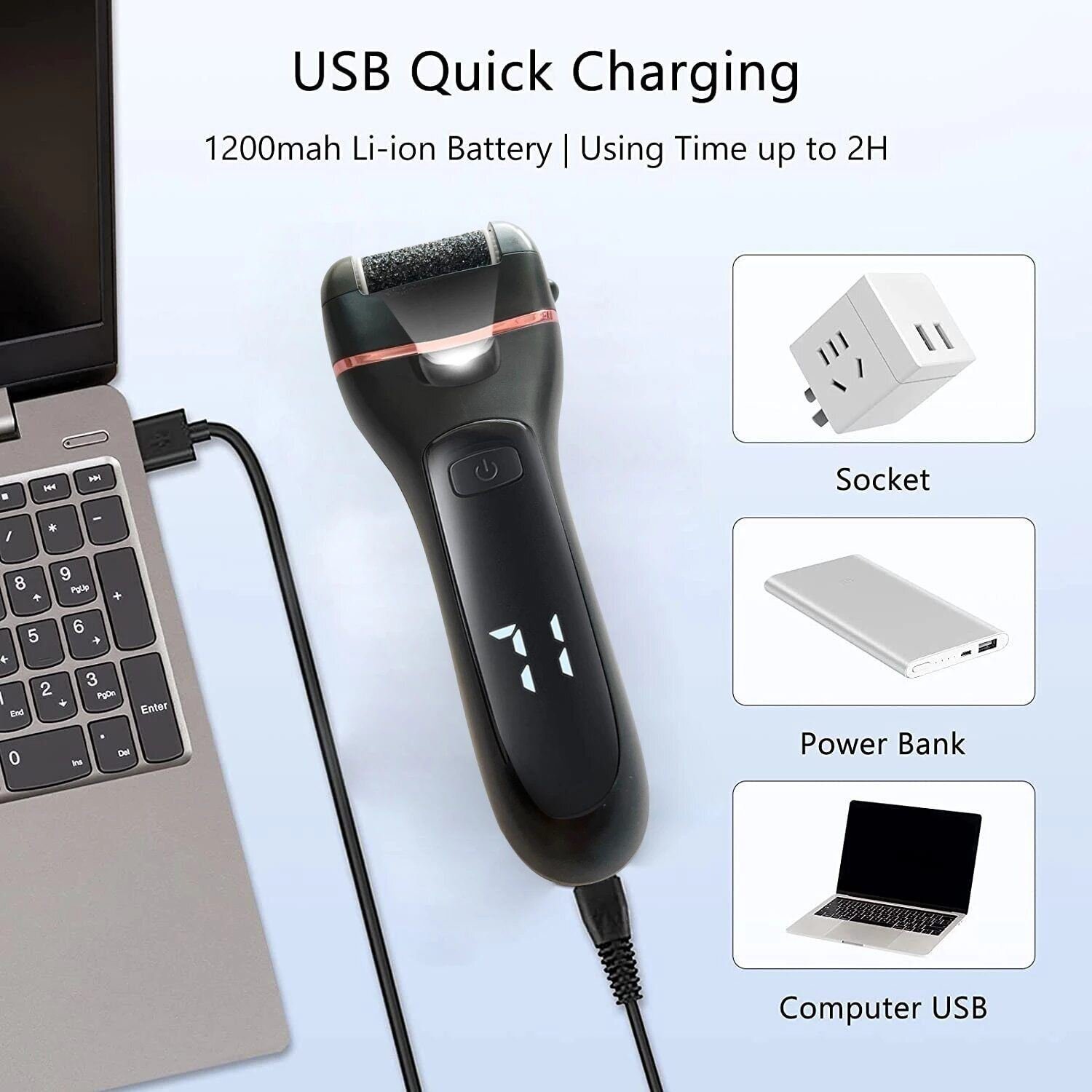 [ LED Display]Foot file hard skin remover is rechargeable with a handy LED display on it showing the charge level and when to put it back on charge. Rechargeable foot file electric with high quality 1200mAh large capacity lithium battery can work for about 60 Minutes. Only charge about 3 hours. The USB charging cable can easily connect to a laptop, computer, power bank, socket, and another USB adaptor.